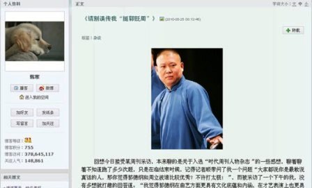 繼韓寒“被封時(shí)代周刊影響人物”事件之后,昨日有網(wǎng)友在論壇瘋狂轉(zhuǎn)載韓寒的最新博文《請(qǐng)別誤傳我“挺郭貶周”》的相關(guān)博客截圖和內(nèi)容,該帖子在網(wǎng)上引起了廣泛的熱議,因?yàn)轫n寒在文中還意外曝出周立波曾和郭德綱在爭(zhēng)演迪斯尼電影《歌舞青春》一角色時(shí)、私下相互較勁并以自降身價(jià)“零報(bào)酬”方式搶?xiě)虻南嚓P(guān)內(nèi)幕,被網(wǎng)友戲稱(chēng)為“郭周搶角門(mén)”。不過(guò)記者上網(wǎng)發(fā)現(xiàn)韓寒博客中的這篇博文已經(jīng)被刪除,為了進(jìn)一步求證博文內(nèi)情及真?zhèn)危浾咴噲D聯(lián)系韓寒,不過(guò)其手機(jī)一直處于呼叫轉(zhuǎn)移留言狀態(tài),隨后記者通過(guò)手機(jī)和博客發(fā)短信留言采訪,截至發(fā)稿時(shí),韓寒方面并未給予回應(yīng)。
