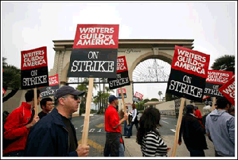 最近,洛杉磯真是不太平。不久前,山林大火燒了一個(gè)多星期,至少造成15億美元的損失。本月5日,好萊塢劇作家們又在工會(huì)的領(lǐng)導(dǎo)下,開始在全美國(guó)罷工。這是20年來(lái)的第一次劇作家罷工,在美國(guó)各界引起相當(dāng)大的反響。這些平日深鎖家中爬格子,難得露面的好萊塢劇作家們,一大早聚集在八大影業(yè)公司以及迪斯尼總部的攝影棚外,他們高舉標(biāo)語(yǔ)牌,聲稱這次對(duì)“電影暨電視制作人聯(lián)盟”展開的罷工,將會(huì)是一場(chǎng)持久而代價(jià)昂貴的行動(dòng)。電視屏幕上馬上就有了反映,一些電視臺(tái)開始播放老舊的內(nèi)容。當(dāng)然,作為同行,演員、主持人、脫口秀主持都非常支持編劇們,到現(xiàn)場(chǎng)慰問,并且在自己的節(jié)目中聲援罷工。
