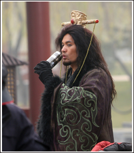 與上部《鳳鳴岐山》相比,《武王伐紂》最大的調(diào)整是由林心如取代范冰冰扮演“紅顏禍水”蘇妲己,而昏庸無道的商紂王也由馬景濤變成了呂良偉。昨天當(dāng)記者趕到片場(chǎng)時(shí),劇組正在布景,預(yù)備拍攝一場(chǎng)雨天妲己為紂王撫琴,二人展現(xiàn)恩愛的戲。雖然在劇中扮演一對(duì)親密愛侶,但拍攝之外,林心如和呂良偉卻各干各的事情,二人坐得非常遠(yuǎn),很少交流。林心如坐在亭子內(nèi)撫琴,身穿一件粉色的輕紗古裝,高挽著發(fā)髻,雖然化著精致的妝容,但總體給人的感覺卻是端莊有余而妖嬈不足。由于天寒地凍,呂良偉在黑色戲裝之外套了一件紅色的羽絨服,雖然還沒有正式開拍,但他的“煙熏妝”造型還是讓人覺得有些不舒服。金色的發(fā)冠,凌亂的頭發(fā),再加上滿臉的絡(luò)腮胡和一貫凌厲的眼神,劇組的群眾演員開玩笑說呂良偉的造型簡直酷似“人猿泰山”。