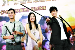 被稱為“偶像版武俠劇“的2008版《射雕英雄傳》(《射雕》)于9日起每晚7時(shí)在廣州電視臺(tái)綜合頻道播出。昨日,《射雕》的主演胡歌、林依晨、袁弘親蒞廣州,現(xiàn)場(chǎng)大批女粉絲早早就前來支持偶像,并紛紛上臺(tái)為3位主演送禮物,結(jié)果胡歌收到的禮物還沒有袁弘多,很多人都認(rèn)為楊康演得非常好。 (記者 陳羽中 實(shí)習(xí)生 王高財(cái)/文 倪黎祥/圖)