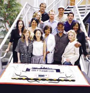 描寫醫(yī)務人員生活的熱門美劇《實習醫(yī)生格蕾》日前完成了第100集的拍攝工作。劇組在洛杉磯的片場舉辦了一個慶祝派對,并特意準備了一個帶有“聽診器”、 “手術(shù)刀”等圖案的大蛋糕。包括帕特里克·德姆西、桑德拉·歐、凱瑟琳·海格爾(前排右一)等主演均到場留下了“全家!薄
