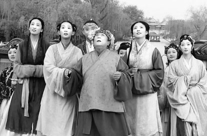 這也是難怪的,不僅因為劉姥姥進(jìn)大觀園的故事深入人心,在拍攝現(xiàn)場,眾金釵們齊刷刷以“銅錢頭”亮相的視覺效果,仍然比不上劉姥姥那滿滿一頭五顏六色的花兒來得“觸目驚心”。100米開外,你可能就分不清誰是釵誰是黛,但劉姥姥那彩色的腦袋絕對是個“移動定位系統(tǒng)”,走多遠(yuǎn)都能一眼望見。