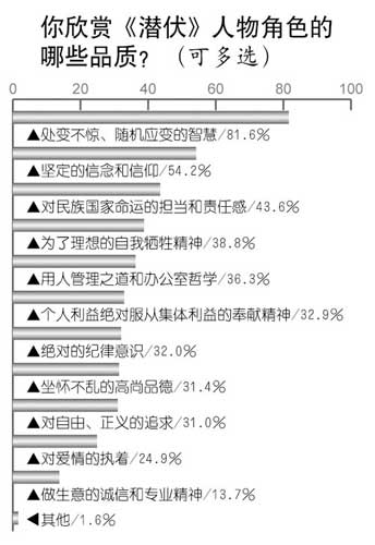 觀眾欣賞《潛伏》中人物的哪些品質(zhì)?調(diào)查中81.6%的人首推“處變不驚、隨機(jī)應(yīng)變的智慧”,54.2%的人選擇“堅(jiān)定的信念和信仰”,43.6%的人選擇了“對(duì)民族國(guó)家命運(yùn)的擔(dān)當(dāng)和責(zé)任感”,接下來(lái)依次為:“為了理想的自我犧牲精神”(38.8%),“用人管理之道和辦公室哲學(xué)”(36.3%),“個(gè)人利益絕對(duì)服從集體利益的奉獻(xiàn)精神”(32.9%),“絕對(duì)的紀(jì)律意識(shí)”(32.0%),“坐懷不亂的高尚品德”(31.4%),“對(duì)自由、正義的追求”(31.0%),“對(duì)愛(ài)情的執(zhí)著”(24.9%),“做生意的誠(chéng)信和專業(yè)精神”(13.7%)。