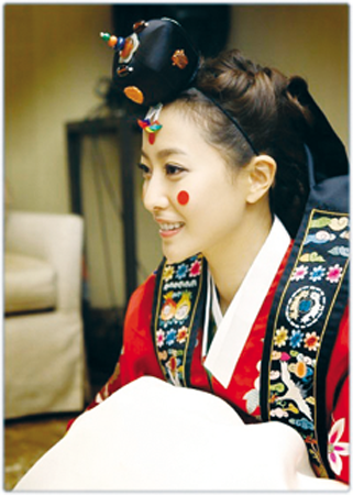 金喜善在自己的主頁上公開的這張相片中身穿韓國傳統(tǒng)新娘禮服,臉上印著胭脂印記,滿臉都是幸福的微笑,金喜善在發(fā)布這張相片時也不忘向給自己買這身衣服的婆婆表示了謝意。(姜恩真)