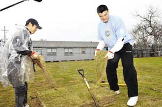 日前,功夫巨星李連杰與中國(guó)球員姚明一起出席了美國(guó)NBA全明星慈善活動(dòng),參加了新奧爾良巨星城的慈善植草皮活動(dòng)。這個(gè)城市在去年遭受到了“卡特琳娜”颶風(fēng)的襲擊,因此這次的全明星球員們不僅僅只是會(huì)去比賽,還會(huì)幫助當(dāng)?shù)鼐用駛冏鲆恍┐壬频氖虑椤F渲兄袊?guó)球員姚明和著名的功夫巨星李連杰也在這些慈善事情中做出了自己的貢獻(xiàn)。圖為李連杰與姚明一起合作植草皮。