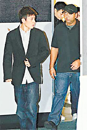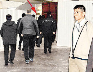 陳冠希(箭頭所指)進出香港警署都有眾多私人保鏢前后簇擁。