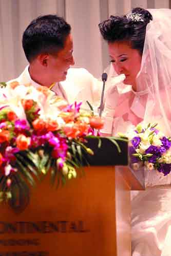 下午6點,婚禮正式開始。據(jù)現(xiàn)場記者透露,王志文和陳堅紅穿著西服和婚紗踏上了紅毯,在婚禮進(jìn)行曲中走上舞臺。著名導(dǎo)演田壯壯擔(dān)當(dāng)證婚人,當(dāng)王志文深情地對著新娘陳堅紅說:“很愛你!”時,陳堅紅不禁淚灑現(xiàn)場,兩人深情舉起香檳,喝了交杯酒。整個儀式只舉行了15分鐘,很簡單,但是很溫馨,現(xiàn)場一位賓客說:“我們都能感受到王志文對陳堅紅的愛!