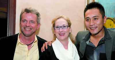 劉燁每天以日記的形式記錄此次北美之行,他在傳給本報的日記中說:“再次見到梅麗爾讓我突然間有些不知道該說些什么,可就在我一愣神的時候,她已經面帶笑容地給了我一個擁抱,她戴著一副黑框眼鏡,顯得年輕又高貴,我們都不自覺地想起了曾經在一起拍戲的日子!彼瑫r還爆料,聽說來年美國奧斯卡的終身成就獎,準備頒給她。 本報記者 唐愛明