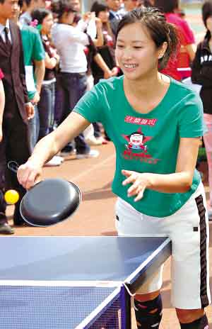 為了給自己的電子雜志《開啦》慶祝“一周歲”生日,徐靜蕾前日召集顧長衛(wèi)、張揚(yáng)以及霍思燕等圈內(nèi)好友在其母校舉行了一場“明星春季運(yùn)動會”。親自擔(dān)任運(yùn)動會總裁判的徐靜蕾,還親自參加了拔河、垃圾障礙跑等項目,并用煎雞蛋的平底鍋大秀乒乓球技,最終獲得乒乓球雙打的冠軍,十分活躍。