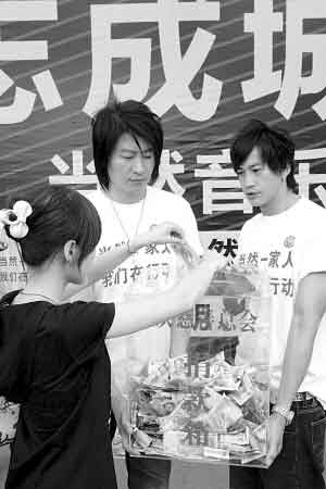 昨天,游鴻明、何潤東、陳怡蓉、沈建宏、鄧寧、劉錫明、阿清、高磊、晨辰等當(dāng)然音樂的歌手抵達(dá)重慶。他們帶著70余萬元的救災(zāi)物資和9顆愛國之心在重慶街頭為汶川地震的災(zāi)后重建募款。在重慶石橋鋪佰騰數(shù)碼廣場、沙坪壩步行街、江北北城天街三個募捐點(diǎn),累計(jì)3小時的募款活動中,何潤東等9位藝人共籌集善款187400余元,目前這個數(shù)字還在不斷增加。