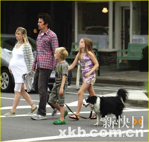 好萊塢男影星伊!せ艨藥е以诩~約一起慶祝父親節(jié)。37歲的伊桑·霍克和正懷孕的女朋友RyanShawhughes 以及兩個(gè)孩子——9歲的MayaRay 和6歲的LevonRoan一起漫步街頭,顯得十分和睦。Maya和Levon的母親是伊桑·霍克的前妻——好萊塢女演員烏瑪·瑟曼。
