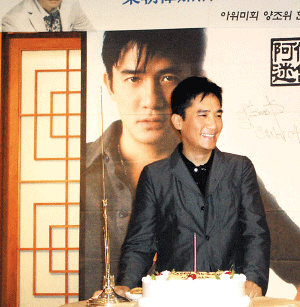 梁朝偉對(duì)著歌迷們準(zhǔn)備的生日蛋糕眉開眼笑。