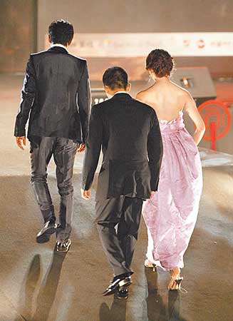 中新網(wǎng)7月9日電 電影《赤壁》昨晚在臺(tái)北新店碧潭斥資千萬元(新臺(tái)幣 下同)舉行戶外首映禮,吸引約3千名民眾圍觀,3名演員金城武、林志玲、張震帶著作品回到臺(tái)灣心情很high,一向惜字如金的金城武致詞時(shí)特別以“鄉(xiāng)親父老”打動(dòng)觀眾,林志玲身著夏姿訂制粉紅色禮服優(yōu)雅動(dòng)人,但因?yàn)樗闲枪獯蟮绖傁逻^雨路滑,她只穿上1吋半的高跟鞋,當(dāng)她走上坡度約45度的紅地毯時(shí),還出現(xiàn)使不上力的狀況,只好用手拖住身后的梁朝偉才順利爬上斜坡。