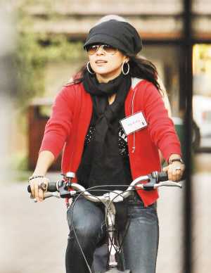 媒體年會(huì)設(shè)在風(fēng)景優(yōu)美的“太陽谷”,章子怡休閑騎單車。