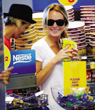 林賽·洛韓和DJ女友薩曼莎·羅森趁拍攝電影《產前陣痛》的間隙漫步在好萊塢北部的街頭,看起來十分甜蜜。她們先到一家音像店挑選光盤,然后又一同前往超市購買美味零食。兩人一路上有說有笑,看上去非常開心。