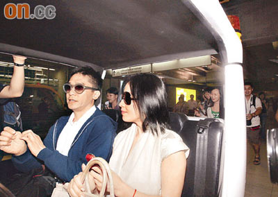 兩人坐機場小車離開,被傳媒圍堵采訪。香港《太陽報》圖。