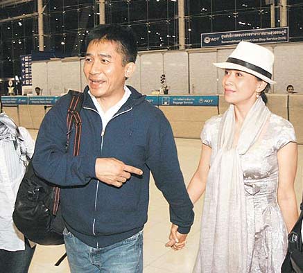 偉仔(左)牽著劉嘉玲抵曼谷機(jī)場(chǎng),準(zhǔn)新人臉上洋溢幸福。