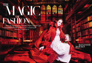 身為才智過人的“魔法優(yōu)等生”,沃森在領(lǐng)悟“裁藝神奇咒”方面同樣了得,無論是穿上亞歷山大·麥昆設(shè)計(jì)的價值上萬美元的大紅禮袍,還是戴上帽型魔術(shù)師菲利普·崔西設(shè)計(jì)的孔雀桂冠,都別有韻味。這些設(shè)計(jì)名家與沃森的合影也新意迭出,有的模仿小說原著中會動的人物肖像“鉆”進(jìn)了油畫,有的則“住”進(jìn)了神秘的水晶球。