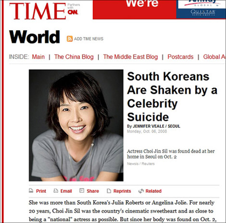 據(jù)《體育朝鮮》報(bào)道,美國(guó)《時(shí)代》雜志網(wǎng)絡(luò)版周二(韓國(guó)時(shí)間7日)通過(guò)題為《明星的自殺震驚全體韓國(guó)人》(South Koreans Are Shaken by a Celebrity Suicide)的報(bào)道,對(duì)把崔真實(shí)逼向絕路的韓國(guó)社會(huì)所存在的問(wèn)題以及崔真實(shí)之死在韓國(guó)社會(huì)引起的震動(dòng)進(jìn)行了集中闡述。