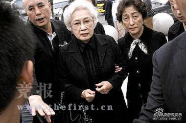 大廳內(nèi)的墻上掛著謝導的遺像,謝晉的遺體邊遍布鮮花,老人戴著眼鏡,就好像睡著了一般,旁邊還放著他最鐘愛的一頂帽子。一點十分左右,謝晉妻子徐大雯和其小兒子阿四到達追悼會現(xiàn)場,強掩住內(nèi)心的悲傷,送謝導最后一程。這幾天,徐大雯堅持從醫(yī)院出來,親自參與布置靈堂,盡管她剛剛安裝了心臟起搏器,精神狀態(tài)很不好。徐大雯這些天說得最多話是:“我不能倒,這個家總得有一個人撐著!弊蛉眨恢北憩F(xiàn)堅強的徐大雯顯得非常憔悴,頭發(fā)花白,走路蹣跚,對著謝晉的遺體說了不少話。