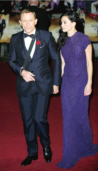 由于在拍攝中受傷,他在走上紅地毯時(shí)胳膊仍打著石膏夾板。在片中繼續(xù)飾演“M”的英國(guó)女演員朱迪·登奇,以及兩位“邦德女郎”、烏克蘭演員兼模特奧莉加·庫(kù)里連科和英國(guó)演員杰瑪·阿特頓也出席了首映式。