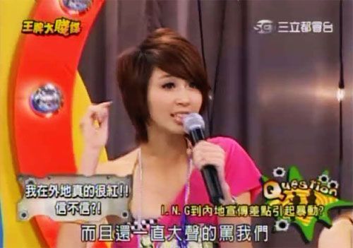 28日,臺灣綜藝節(jié)目《王牌大賤諜》播出主題為“在外地比臺灣紅的藝人”訪談。女子組合I.N.G在節(jié)目中公然宣稱自己在大陸很紅,并夸張講述大陸歌迷的追星情節(jié),同時嘲笑大陸的衛(wèi)生習(xí)慣和飲食風(fēng)俗。節(jié)目播出后,大陸網(wǎng)友紛紛表示憤慨,集體攻擊I.N.G論壇和貼吧,并聯(lián)名要求封殺該組合。