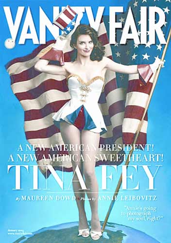 《名利場》雜志2009年1月號封面,邀在大選期間因模仿共和黨候選人莎拉·佩林而走紅的蒂娜·菲當(dāng)封面女郎。照片中,菲穿著美國國旗色的性感低胸超短裙,手執(zhí)美國國旗,神采飛揚(yáng),雜志封面的大標(biāo)題是“新美國總統(tǒng),新美國甜心”。蒂娜·菲還在該雜志的專訪中透露自己是扁平足患者。