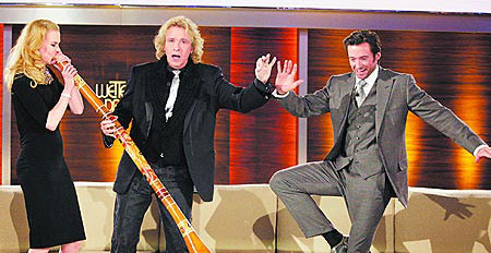 妮可(左)上節(jié)目吹奏澳洲土著樂器,銀幕搭檔休·杰克曼(右)金雞獨(dú)立。