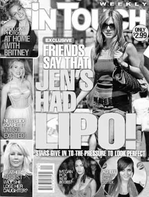 該雜志先前認(rèn)為安妮斯頓在臉部、嘴唇、胸部和鼻子都做過手腳,而這些猜想最后由安妮斯頓的朋友加以證實(shí)。據(jù)該朋友介紹,安妮斯頓因?yàn)閾?dān)心自己被讀者看出年華老去,因此在身上作了不少微整形,最后效果引得讀者大贊的同時,也讓她第二天參加新片首映會時吸引更多媒體上門采訪。
