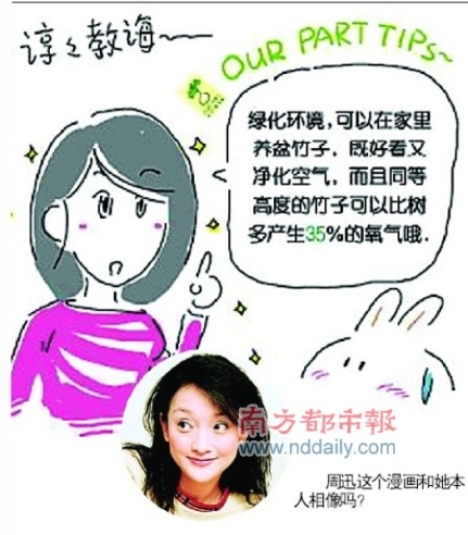 周迅日前推出“周粥”合作———和國內(nèi)當紅漫畫家胖兔子粥粥合作漫畫專欄,推廣環(huán)保意識。