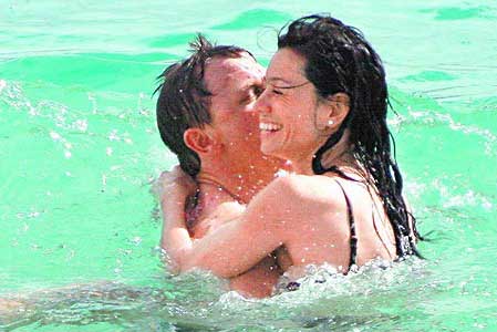 中新網12月30日電 “007”丹尼爾·克雷格(Daniel Craig)新片《007量子危機》票房不俗,他開心帶著女友米歇爾享受假期。兩人上周飛到加勒比海躲避倫敦寒冬,在溫暖的海水里打情罵俏,親熱畫面簡直就是他在《007首部曲:皇家夜總會》和龐德女郎伊娃葛林調情的翻版,真是戲里戲外都在演龐德。
