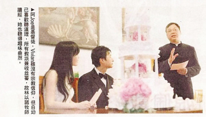 5日下午,一眾出席倪周婚禮的賓客在四時前到場,獲邀擔(dān)任證婚人的是好友Kenny與丈夫吳先生;橐霰O(jiān)理人由陳姓律師擔(dān)任,儀式簡單卻神圣。一對新人宣讀誓詞,然后交換結(jié)婚戒指,簽上名字,再將別致的羽毛筆交到婚姻監(jiān)理人與證婚人手上,簽名后林以諾牧師現(xiàn)身,宣讀哥林多前書十三章至八節(jié)——愛是恒久忍耐,又有恩慈,愛是不嫉妒,愛是不自夸,不張狂……以祝福一對有情人,壓軸節(jié)目是新人切結(jié)婚蛋糕,與眾同樂,一起分享甜蜜滋味。