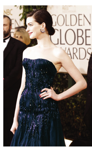 雖然沒有領(lǐng)到“金球”,但是安妮·海瑟薇在紅地毯上分外搶眼,鑲有藍色寶石的孔雀型耳環(huán)與寶石藍金絲裹胸禮服相得益彰!