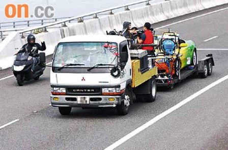 昨日清晨七時(shí),成龍與祖名穿超時(shí)空戰(zhàn)士的“父子裝”抵達(dá)青馬大橋,駕駛熒光黃色和綠色的左跑車,車尾則放了一大箱冰凍道具樽裝茶,非常搶眼。坐在司機(jī)位的成龍?jiān)诠飞巷L(fēng)馳電掣,狀甚威風(fēng),其實(shí)他們的跑車被固定在貨車托尾板上,相反攝影師要站在托尾板上拍攝,當(dāng)有大風(fēng)或大貨車經(jīng)過扯風(fēng)時(shí),令攝影師搖搖欲墜,驚險(xiǎn)萬分。
