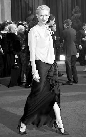 蒂爾達(dá)在奧斯卡一向喜歡以特立獨(dú)行的雷人裝扮出現(xiàn),這次同樣沒(méi)讓人失望。暗淡的淺金色加黑裙搭配很怪異,像去趕一場(chǎng)普通會(huì)議,艷麗的紅唇又好像彰現(xiàn)奢華,總之過(guò)于隨便。