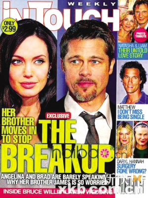 布拉德·皮特和安吉麗娜·朱莉的夢(mèng)幻愛(ài)情,似乎有幻滅的趨勢(shì)。最近,不止一家的美國(guó)雜志報(bào)道了兩人的感情危機(jī)。就連臺(tái)灣媒體也不甘示弱,報(bào)道中稱布拉德·皮特、安吉麗娜·朱莉關(guān)系陷入冰點(diǎn),兩人協(xié)議暫時(shí)分居。假如情勢(shì)無(wú)法挽回,小布將爭(zhēng)取六名子女的監(jiān)護(hù)權(quán),另外,高達(dá)2億美元的財(cái)產(chǎn)分配問(wèn)題,恐怕也會(huì)讓這對(duì)“史密斯夫婦”展開(kāi)廝殺。