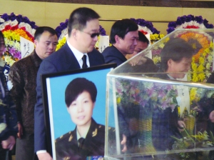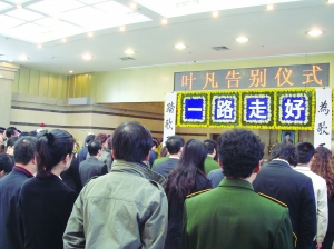 昨天的追悼會現(xiàn)場不但來了很多葉凡生前的好友,也來了不少葉凡生前的戰(zhàn)友,據(jù)武警文工團政委尚力峰介紹,“當聽說葉凡去世的消息后,所有和她合作過的戰(zhàn)友都驚呆了,我們都不知道她的病情居然那么嚴重,她沒告訴我們,是不想讓我們操心啊!因為武警文工團即將要有幾個大型的演出,所以戰(zhàn)友們不能全來,但他們送上了花圈表示哀悼。葉凡在我們團是出類拔萃的臺柱子,大型晚會不能少了她,她平時對自己要求十分嚴格,對于創(chuàng)作也是一絲不茍。有一次某地發(fā)生洪澇災害,葉凡主動請求到一線演出慰問,并創(chuàng)作《真情永遠》。2003年非典時期,葉凡已經得病,但她沒有說任何理由,再次主動要求參加創(chuàng)作,并寫出《天使的故事》,讓全團都為之感動。她也多次獲得過文化部一等獎,可以說現(xiàn)在正是葉凡最輝煌的時期,可她卻離我們而去,太可惜了!”
