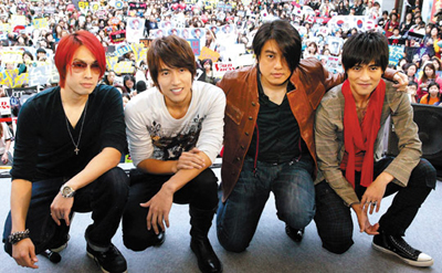 F4前天在淡水漁人碼頭發(fā)表新歌,4人合體魅力加倍,唱片銷售量暴增7000張,昨天趁勢(shì)舉辦專輯蓋印會(huì),滿足粉絲跟F4近距離接觸。面對(duì)媒體逼問,仔仔雖然心情沉重,但一站上舞臺(tái)仍擠出笑臉,溫柔地幫歌迷披上圍巾,還拱朱孝天跟歌迷舌吻。意外搶走焦點(diǎn),仔仔對(duì)F3感到不好意思,朱孝天笑說,“仔仔功力大增,我現(xiàn)在管不住他了!