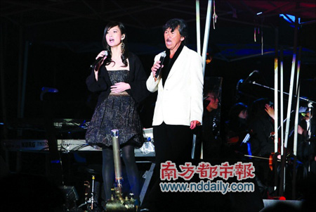 前晚廣州的氣溫跌到6攝氏度,再加上連綿小雨,的確是一個(gè)“打狗都不出門”的天氣。而演唱會(huì)在上座率不足三分之一的情況下,終于在延時(shí)20分鐘后開場了。林子祥(阿lam)一出場就是一首氣勢奪人的《男兒當(dāng)自強(qiáng)》,可是“熱血熱腸熱,熱勝紅日光”的歌詞,卻沒能讓觀眾馬上投入,一曲完畢,掌聲弱不可聞,歡呼聲同樣寥落。演唱會(huì)幾乎就在同樣的氣氛中進(jìn)行了大半場,無論是阿lam本人主動(dòng)走到臺(tái)下與觀眾握手,還是嘉賓盧冠廷的出場,甚至是同樣作為嘉賓上臺(tái)的玉女周慧敏以“大家如果更熱情點(diǎn),我會(huì)覺得暖些”,暗示有可能將罩在低胸小禮服外的外套脫掉,都無法徹底調(diào)動(dòng)起龜縮在大衣下的觀眾的情緒,短暫的小高潮過去,轉(zhuǎn)瞬又歸于平靜。