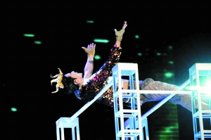 郭富城在3米高的鋼架作出的“托馬斯全旋”的體操動(dòng)作。時(shí)報(bào)記者 龍成關(guān) 攝