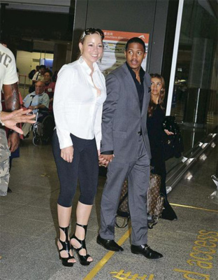瑪麗亞·凱莉與丈夫步出機(jī)場。圖片均來自香港《明報(bào)》