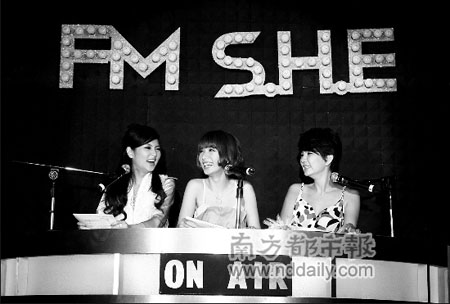 距離上一張《PLAY》專輯已經(jīng)過了將近1年半,即使唱片市場越來越不景氣,但《FMS.H.E》的臺灣預(yù)購量還是沖到了4.2萬張,讓S.H.E又驚又喜。前日在重金打造的豪華旋轉(zhuǎn)DJ臺上,身著美麗小禮服的S.H.E三人,不僅聲音悅耳,身材也讓大家驚艷,可惜播報新聞時輪流吃了幾次螺絲,把嚴(yán)肅的新聞報得笑果十足(見右圖)。事后她們?nèi)滩蛔舌?“舞臺正前方的聚光燈太強(qiáng)了啦,讓我們看不清楚稿子,平常錄電臺節(jié)目時,并不會這樣的嘛!