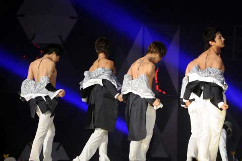 29日下午,“2008 SBS歌謠大典”在京畿道一山國際展覽中心(KINTEX)進(jìn)行了現(xiàn)場直播。節(jié)目當(dāng)天,東方神起在上臺演唱熱門歌曲《咒文》(MIROTIC)時(shí),在結(jié)尾處齊齊脫去上衣亮出了有型背肌,引得現(xiàn)場粉絲尖叫連連。