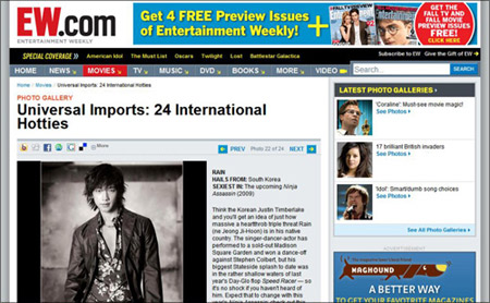 據(jù)體育朝鮮報(bào)道,《娛樂(lè)周刊》舉出Rain最性感的代表作品為今年即將上映的影片《忍者殺手》。并介紹說(shuō),他被譽(yù)為韓國(guó)的“賈斯汀-汀布萊克”,歌聲、舞蹈、演技樣樣出色,他還在紐約麥迪遜廣場(chǎng)花園劇院舉行演唱會(huì)、參加電視綜藝節(jié)目《科爾伯特報(bào)告》等,在美國(guó)表現(xiàn)得也十分活躍。