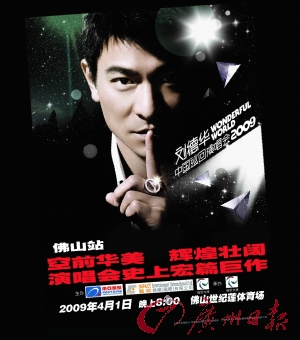 他成就了一種精神——永不言敗,他鑄就了一個(gè)榜樣——奮斗不息,他就是華人演藝圈的“勞!薄?jiǎng)⒌氯A。在2009本命年,劉德華將把 “Wonderful World(奇幻世界)”巡回演唱會(huì)帶到中國(guó)內(nèi)地,馬不停蹄地與各地樂(lè)迷分享他出道以來(lái)最豪華的演唱會(huì)。而值得廣東樂(lè)迷開(kāi)心的是,劉天王將于3月20日和4月1日分別登陸廣州奧林匹克中心和佛山世紀(jì)蓮體育場(chǎng),兩場(chǎng)演唱會(huì)都可容納3萬(wàn)多樂(lè)迷。