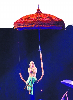 3月初,“小甜甜”布蘭妮展開她的復(fù)出巡回演唱會, 多變的造型堪比麥當(dāng)娜,內(nèi)衣外穿,野蠻女警等造型都堪稱火辣。為配合新專輯《馬戲團》,布蘭妮打扮成馬戲團表演者,在舞臺上奉獻了很多雜技表演,她還蒙上眼睛與兩名男舞者一起跳舞一起演唱《Touch of My Hand》。她在高空坐在“傘柄”上以印度舞娘造型出場,遠看甚為驚艷,近看發(fā)現(xiàn)她腹部堆積著贅肉,跳肚皮舞倒是不錯?磥聿继m妮還需要減肥。