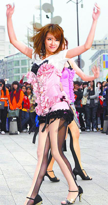 中新網(wǎng)3月28日電 蔡依林(Jolin)昨日(27日)在西門町封街拍新歌《花蝴蝶》舞蹈教學(xué)示范帶。Jolin身穿粉紅馬甲、黑色蕾絲邊粉紅小熱褲,腳上已舍棄美美高跟鞋,改以專業(yè)的國標(biāo)舞鞋上陣,只為了避免腳踝舊疾復(fù)發(fā)。
