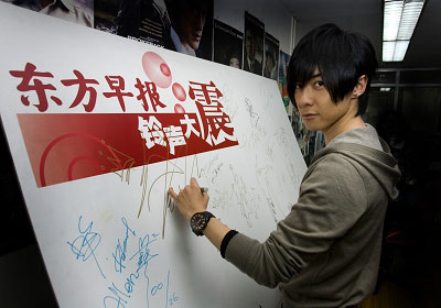 由于活動推遲了20分鐘,唐禹哲還未坐定,電話便響個不停,而唐禹哲來不及喝口水潤喉便認真地與FANS聊起來。聽說這位打進電話的FANS,正是在前日簽售會上為自己送禮物的人,唐禹哲連連道謝,“我看到大家托你送的很大一包東西了,我很喜歡,我會帶回臺灣去的!甭牫鯢ANS對他的話持著半信半疑的態(tài)度,唐禹哲又反復(fù)強調(diào),“我有拆開來看過,是玉和胸章對吧!”讓對方受寵若驚忍不住尖叫。
