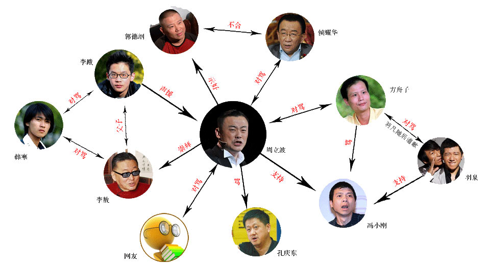 原本大家關注周立波是因為他的清口、他的八卦,現(xiàn)在關注周立波緣于他和網(wǎng)民們的一場口舌之戰(zhàn)!叭魧⒕W(wǎng)絡民意當真,實是一種‘自宮’行為”,周立波在微博上發(fā)聲后,隨即又提出“網(wǎng)絡公廁論”。在引起眾多網(wǎng)友的不滿后,“打假斗士”方舟子、孔慶東和葉匡正也被卷入其中! [詳細]