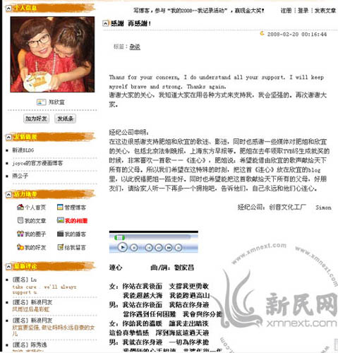 在這邊很感謝支持肥姐和欣宜的歌迷、影迷,同時也感謝一些媒體對肥姐和欣宜的關心,包括北京法制晚報,上海東方早報等。肥姐在去年領取TVB終生成就獎的時候,非常喜歡一首歌——《連心》,肥姐說:希望能借由欣宜的歌聲獻給天下所有的父母。所以我們希望在這特殊的時刻,把這首《連心》放在欣宜的blog里,以此祝福肥姐一路走好。同時也希望能把這首歌獻給天下所有的父母,好朋友們,請給家人聽一下再多一個擁抱吧,告訴他們,自己永遠和他們心連心。